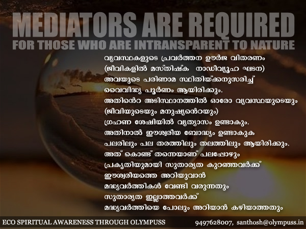 വ്യവസ്ഥകളുടെ പ്രവര്ത്തന ഊര്ജ വിതരണം (ജീവികളില് മസ്തിഷ്ക – നാഡീവ്യൂഹ ഘടന) അവയുടെ പരിണാമ സ്ഥിതിയ്ക്കനുസരിച്ച് വൈവിദ്ധ്യ പൂര്ണം ആയിരിക്കും. അതിന്റെ അടിസ്ഥാനത്തില് ഓരോ വ്യവസ്ഥയുടെയും (ജീവിയുടെയും മനുഷ്യന്റെയും) ഗ്രഹണ ശേഷിയില് വ്യത്യാസം ഉണ്ടാകും. അതിനാല് ഈശ്വരീയ ബോദ്ധ്യം ഉണ്ടാകുക പലരിലും പല തരത്തിലും തലത്തിലും ആയിരിക്കും. അത് കൊണ്ട് തന്നെയാണ് പലപ്പോഴും പ്രകൃതിയുമായി സുതാര്യത കുറഞ്ഞവര്ക്ക് ഈശ്വരീയത്തെ അറിയുവാന് മദ്ധ്യവര്ത്തികള് വേണ്ടി വരുന്നതും സുതാര്യത ഇല്ലാത്തവര്ക്ക് മദ്ധ്യവര്ത്തിയെ പോലും അറിയാന് കഴിയാത്തതും