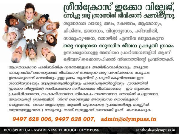 ഗ്രീന് ക്രോസ് ഇക്കോ വില്ലേജു (സ്വാശ്രയ സുസ്ഥിര ജീവന പ്രകൃതി ഗ്രാമം) നാളെയെ പറ്റി ബോദ്ധ്യമുള്ള സന്മനസ്സുകളെ ഒന്നിച്ചു ഒരു ഗ്രാമത്തില് ജീവിക്കാന് ക്ഷണിക്കുന്നു.