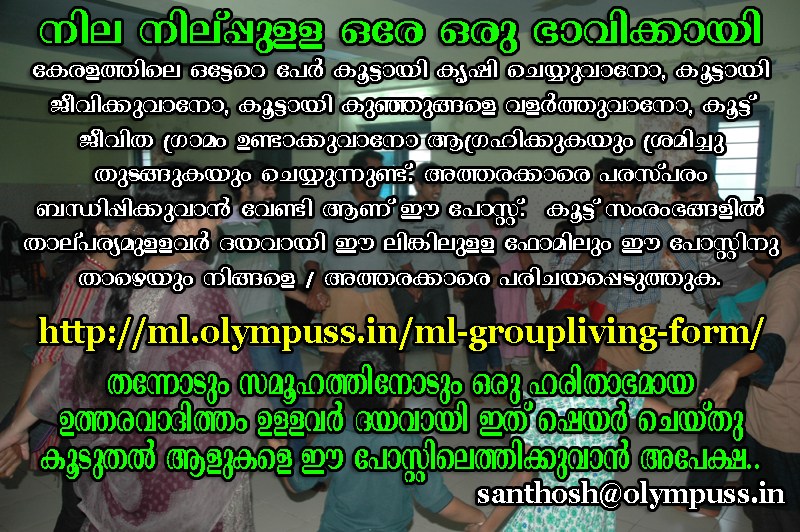 കേരളത്തിലെ ഒട്ടേറെ പേര് കൂട്ടായി കൃഷി ചെയ്യുവാനോ, കൂട്ടായി ജീവിക്കുവാണോ, കൂട്ടായി കുഞ്ഞുങ്ങളെ വളര്ത്തുവാണോ കൂട്ട് ജീവിത ഗ്രാമം ഉണ്ടാക്കുവാനോ ആഗ്രഹിക്കുകയും ശ്രമിച്ചു തുടങ്ങുകയും ചെയ്യുന്നുണ്ട്. അത്തരക്കാരെ പരസ്പരം ബന്ധിപ്പിക്കുവാന് വേണ്ടി ആണ് ഈ പോസ്റ്റ്. കൂട്ട് സംരംഭങ്ങളില് താല്പര്യമുള്ളവര് ദയവായി ഈ ഫോമിലൂടെ നിങ്ങളെ / അത്തരക്കാരെ പരിചയപ്പെടുത്തുക.