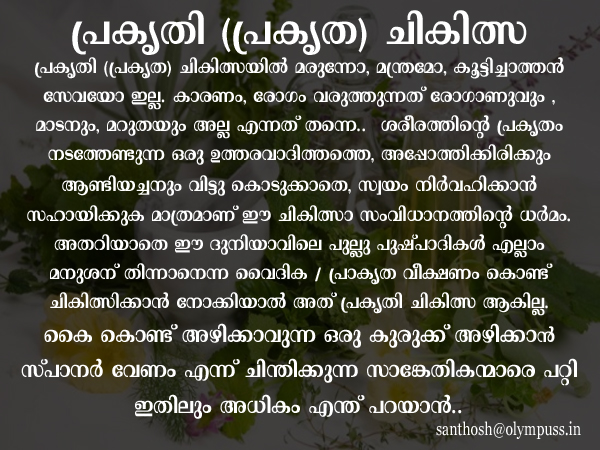 പ്രകൃതി (പ്രകൃത) ചികിത്സയിൽ മരുന്നോ, മന്ത്രമോ, കൂട്ടിച്ചാത്തൻ സേവയോ ഇല്ല. കാരണം, രോഗം വരുത്തുന്നത് രോഗാണുവും , മാടനും, മറുതയും അല്ല എന്നത് തന്നെ… ശരീരത്തിന്റെ പ്രകൃതം നടത്തേണ്ടുന്ന ഒരു ഉത്തര വാദിത്തത്തെ, അപ്പോത്തിക്കിരിക്കും ആണ്ടിയച്ചനും വിട്ടു കൊടുക്കാതെ, സ്വയം നിർവഹിക്കാൻ സഹായിക്കുക മാത്രമാണ് ഈ ചികിത്സാ സംവിധാനത്തിന്റെ ധർമം. അതറിയാതെ ഈ ദുനിയാവിലെ പുല്ലു പുഷ്പാദികൾ എല്ലാം മനുശന് തിന്നാനെന്ന വൈദിക / പ്രാകൃത വീക്ഷണം കൊണ്ട് ചികിത്സിക്കാൻ നോക്കിയാൽ അത് പ്രകൃതി ചികിത്സ ആകില്ല. കൈ കൊണ്ട് അഴിക്കാവുന്ന ഒരു കുരുക്ക് അഴിക്കാൻ സ്പാനർ വേണം എന്ന് ചിന്തിക്കുന്ന സാങ്കേതികന്മാരെ പറ്റി ഇതിലും അധികം എന്ത് പറയാൻ..