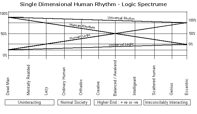 ഇതില് താളമെന്നത് സഹജാവബോധവും യുക്തിയെന്നത് ബുദ്ധിയുമാണെന്ന് വിവക്ഷിക്കാം. താള യുക്തികളിലെ വിപരീതനുപാത വൈവിദ്ധ്യം മനുഷ്യരിലും വൈവിദ്ധ്യമുണ്ടാക്കുന്നു. ബോധമുള്ളവര് നൈസര്ഗികതയോട് അടുത്തും ബുദ്ധിയുള്ളവര് നൈസര്ഗികതയോട് അകന്നും കഴിയുന്നു. ബുദ്ധിയുള്ളവര്ക്ക് പ്രാപഞ്ചിക ജ്ഞാനം സ്ഥിതി വിവരങ്ങളില് നിന്നും കിട്ടുമ്പോള് ബോധമുള്ളവര്ക്ക് ലീനമായ രൂപത്തിലുണ്ടാകുന്നു. ബോധ-ബുദ്ധി അനുപാതം ഏതാണ്ട് സമമായവര്ക്ക്, ലീനമായ പ്രാപഞ്ചിക ജ്ഞാനത്തെ ബുദ്ധിയായാല് പരിഭാഷപ്പെടുത്താനുമാകുന്നു.