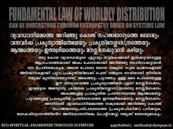ഒരു കോശ വ്യവസ്ഥയുടെ ഏറ്റവും സുഖകരമായി ഇരിക്കുവാനുള്ള ആഗ്രഹത്തെയാണ് അകം ചോദനയായി അറിഞ്ഞു നടപ്പിലാക്കുവാന്‍ നാം പ്രേരിതമാകുക. അതെ പോലെ തന്നെ നമ്മുടെ സുഖ കാമനകളാണ് അര്‍ത്ഥനകളായി പുറം പ്രകൃതിയിലേക്ക് ചെന്ന് നമ്മുടെ ഭാവിയായി തിരികെ നമുക്ക് മുന്നിലെത്തുന്നത്. അകത്തും പുറത്തും ഉള്ള ഒരേ പോലെയുള്ള ഈ വിന്യാസത്തെ പ്രകൃത്യാത്മീയത എന്ന് മനസ്സിലാക്കാം. ഇവയുടെ അന്യോന്യ ക്രിയയെ പ്രകൃതിമനശ്ശാസ്ത്രമെന്നു മനസ്സിലാക്കാം. അകത്തുള്ള പ്രാകൃതീയ പ്രതിഭാസത്തെ ആത്മമെന്നും പുറത്തുള്ള പ്രാകൃതീയ പ്രതിഭാസത്തെ ഈശ്വരീയമെന്നും മനസ്സിലാക്കാം. അതിനാല്‍ വ്യവസ്ഥാനിയമത്തെ സമഗ്രമായി അറിഞ്ഞു കൊണ്ട് സഹജാരോഗ്യപരിപാലനത്തെ (പ്രകൃതചികിത്സ) പഠിക്കുക, ലോകവിന്യാസത്തിന്‍െറ അടിസ്ഥാനനിയമം (പെന്‍റാക്കൂ) നമുക്ക് ബോദ്ധ്യമാകും.
