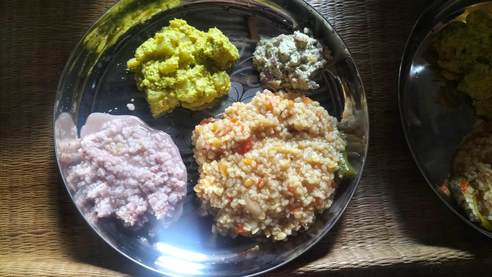 രാവിലെ 11:00 മണിയും വൈകീട്ട് 6:00 മണിയും ആണ് ഔദ്യോഗിക ഭക്ഷണ സമയം. ക്യാമ്പുകളില് ഇത് കൃത്യമായി പാലിക്കും. എന്നാല് മറ്റു ദിവസങ്ങളില് ധാരാളം പണികളും ചെയ്യുവാന് പരിമിതമായ അംഗങ്ങളും മാത്രം ആകുമ്പോള് ഈ സമയം നീണ്ടു പോകാറുണ്ട്. എല്ലാവരും ചേര്ന്നിരുന്നു അന്ന വിചാരം ചെയ്തിട്ടാണ് പാചകം ചെയ്ത ഭക്ഷണം കഴിക്കുക. പാചകം ചെയ്യാത്ത സ്വാഭാവിക ഭക്ഷണം കഴിക്കുന്നവരും ഇതേ സമയത്ത് തന്നെ ആണ് കൂടുക.